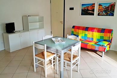 Tranquillo trilocale al 1° e unico piano senza ascensore: 1 camera grande matrimoniale con terzo letto, cameretta con 2 letti singoli, soggiorno-pranzo con divano letto, angolo cottura, bagno con vasca-doccia e lavatrice, TV, aria condizionata, comodo terrazzo abitabile affacciato sulla zona pedonale, n.1 posto auto numerato e n.1 posto spiaggia. Totale posti letto: 5+1.