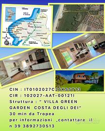 Identificativo Nazionale e Regionale : CIN : IT0102027C26KSST13 Struttura : " VILLA GREEN GARDEN - COSTA DEGLI DEI . ALL ' INTERNO DI UN BELLISSIMO COMPLESSO RESIDENZIALE SITuUATO DIRETTAMENTEt SULLA COSTA TIRRENICA , PRIVATO AFFITTA CONFORTEVOLE VILLETTA SU DUE LIVELLI CON GRANDE GIARDINO E PORTICO CHIUSO , DOPPI SERVIZI, 3 CAMERE DA LETTO AL PIANO SUPERIORE ( 2 MATRIMONIALI ED 1 SINGOLA , PER UN TOTALE DI 6 POSTI) , BAGNO . AL PIANO TERRA E' PRESENTE ALTRO BAGNO DI SERVIZIO CON LAVATRICE ,SOGGIORNO CON CUCINA DA DOVE SI ACCEDE AL GIARDINO ATTREZZATO , TAVOLO /SEDIE E DOCCIA ESTERNA CON ACQUA CALDA E FREDDA . IN TUTTI GLI AMBIENTI , ZONA NOTTE E ZONA GIORNO SONO PRESENTI CLIMATIZZATORI .PRESENTI ZANZARIERE IN TUTTE LE CAMERE DA LETTO . ZONA LAVANDERIA, ZONA RELAX , POSTO AUTO CUSTODITO ,ESTERNO ALLA VILLETTA . IL VILLAGGIO SI TROVA A 400 METRI DALLA BELLISSIMA SPIAGGIA DI SABBIA BIANCA, LA SPIAGGIA E' RAGGIUNGIBILE A PIEDI CON PISTA PEDONALE OPPURE IN MACCHINA ATTRAVERSANDO UNA RIGOGLIOSA PINETA MEDITERRANEA . E' POSSIBILE USUFRUIRE DI SPIAGGIA LIBERA CON PROPRIO OMBRELLONE , OPPURE USUFRUIRE DI UNA PISCINA A 200 METRI DALLA VILLETTA PAGANDO A PARTE ,. E' POSSIBILE USUFRUIRE ANCHE DI VARI CAMPI DA GIOCO . IL COMPLESSO RESIDENZIALE SI TROVA A 4 KM DAL CENTRO DI PIZZO CALABRO, - RINOMATA LOCALITA' TURISTICA - 15 MIN D'AUTO DALL'AEROPORTO INTERNAZIONALE DI LAMEZIA TERME , 20 MINUTI D'AUTO DALLA FAMOSISSIMA TROPEA .QUALSIASI INFORMAZIONE CONTATTARE il 393892730513.