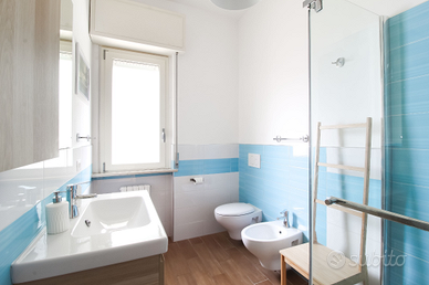 Affitto, da Maggio ad Ottobre, questo favoloso immobile, ad 80 MT dal lungomare, al primo piano con ascensore ( completamente ristrutturato e finemente arredato), di mq 115, che può ospitare 7/8 persone, composto da enorme cucina/ soggiorno di 38 mq, con divano in pelle recliner, divano letto matrimoniale e due terrazzi; zona notte, composta da due camere da letto matrimoniali, con altro terrazzo che le collega, da 2 bagni entrambi con box doccia e un ripostiglio.
