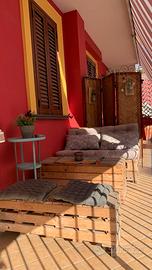 Fuori la camera è allestito un salottino in legno con divani e tavolino.