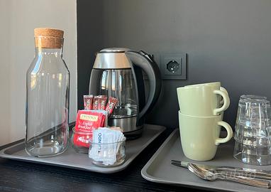 Il living è completato da ampio piano d'appoggio, piccolo tavolino, frigo minibar; in dotazione bollitore con tazze e bicchieri, kit di benvenuto con caffè, tè, zucchero.