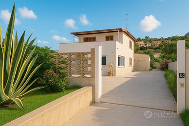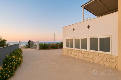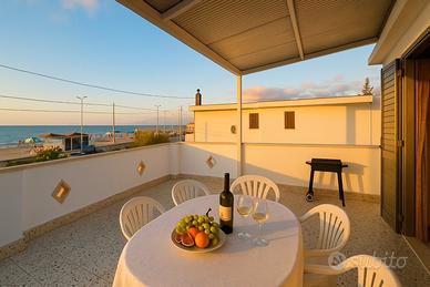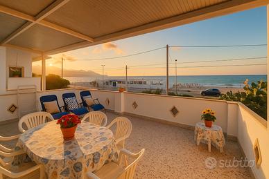 L'abitazione, situata in posizione privilegiata fronte mare, si sviluppa su un unico livello e dispone di ampi spazi sia interni che esterni. La veranda panoramica coperta, attrezzata con tavolo da pranzo e comode chaise longue, offre uno spettacolo unico al tramonto: il luogo perfetto per cene all'aperto o momenti di relax con vista sul Golfo.