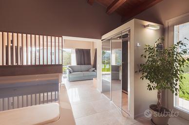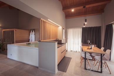 La Suite la Quercia si trova al piano terra del nuovo edificio. È composto da spa privata composta da: sauna, vasca idromassaggio e doccia emozionale, cucina/soggiorno con accesso diretto al portico esterno, camera matrimoniale e bagno.