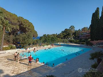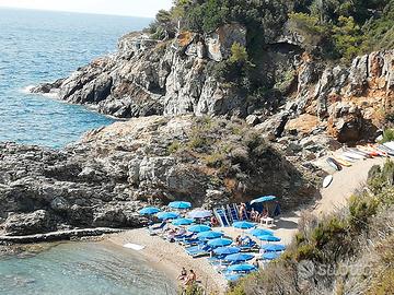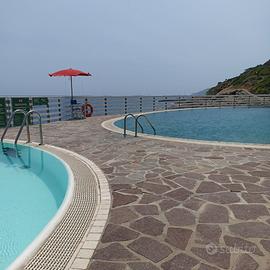 A cinque minuti a piedi dal mare, situato nello splendido comprensorio privato di Capo d'Arco, all'isola d'Elba, sulla costa tra Rio Marina e Porto Azzurro, l'appartamento ha accesso indipendente al piano rialzato, con tre affacci liberi. Si compone di camera matrimoniale con due grandi finestre che si aprono sulla pineta, cameretta con letto a castello, zona giorno con cucina e divano letto da una piazza e mezzo, bagno con finestra e doccia. Completa l'appartamento una grande e piacevole terrazza, in parte coperta da tettoia, sulla quale si può pranzare o prendere il sole. Dalla terrazza si vede il mare. La casa è fresca perché situata in una zona di Capo d'Arco sempre gradevolmente ventilata. Il comprensorio, dotato di piscine d'acqua salata sulla scogliera, piscine d'acqua dolce, spiaggia privata, minimarket ristorante-self service-pizzeria, campi da tennis, calcetto, beach volley, servizio di portineria, è particolarmente adatto anche per lunghe passeggiate con viste incantevoli e lo snorkeling di fondali meravigliosi. Posto auto riservato. Riduzione sul prezzo del traghetto.
