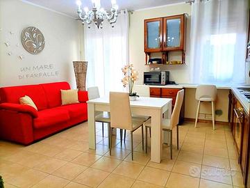 Splendido appartamento di recente costruzione situato a soli 300 mt dal mare dove si raggiunge in soli 5 min.a piedi,nel nuovo quartiere residenziale a Vasto Marina,si affitta per il periodo estivo.Dotato di ogni confort al 2° piano con ascensore.Si presenta,bello spazioso,comodo,e molto luminoso ed e' composto da: un bell'ingresso con un'ampia sala da pranzo,dove si trova anche un comodo divano letto matrimoniale, e una cucina ottimamente attrezzata e rifinita con utensileria di vario genere.La quale si affaccia su' di un grande terrazzo correlato con tende da sole,lavatoio, un bel tavolo e sedie,dove si puo' comodamente pranzare e cenare all'aperto.Vi e' poi la camera matrimoniale anch'essa con un bel terrazzo arredato con un grazioso salottino,,e una cameretta con 2 lettini e un terrazzo grande comunicante con la zona giorno,entrambe ben arredate nei minimi particolari.Il bagno e' ben servito con box doccia,lavatrice,e asciugacapelli.I confort presenti sono:Condizionatore zona giorno e notte,tv,ferro da stiro,asse,e posto auto privato di proprieta'recintato con cancello automatico.Un'apprezzamento aggiuntivo e' dato dal fatto che al di fuori del residence vi e' un comodissimo mini market, utile per la spesa giornaliera..Il residence si trova sulla litorale che collega Vasto Marina a San Salvo Marina, il mare davanti a casa si fregia della prestigiosa " Bandiera blu"dove si trovano sia spiagge pubbliche che attrezzate.Nelle immediate vicinanze si trovano centri commerciali a 3 km,uscita autostradale a 3 min d'auto,stazione ferroviaria a 500 mt,fermata bus a 100 mt.Mini market a 100 mt. bar,noleggio biciclette che si possono utilizzare per percorrere la bellissima pista ciclabile che passa innanzi a casa, lunga 11 km che costeggia la spiaggia e la riserva naturale.Nell'appartamento sono ammessi animali.