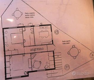 COMPOSIZIONE INTERNA: Ingresso a corridoio - Saletta da pranzo - Due camere matrimoniali - Cucina abitabile attrezzata (4 fuochi, forno, frigo, freezer) - Bagno con lavabo, vasca con doccino, bidet e WC - Terrazza frontale di 12 m² e Patio coperto di 10 m² sul retro, entrambi con tavolo e sedie.