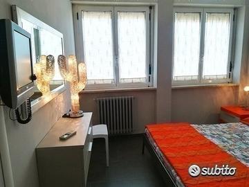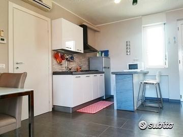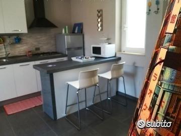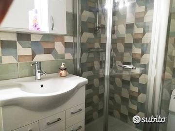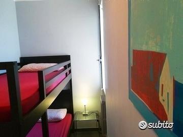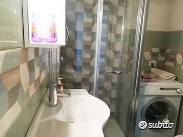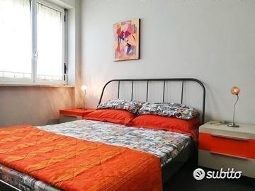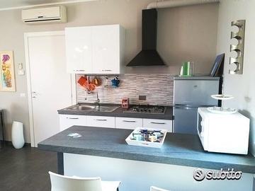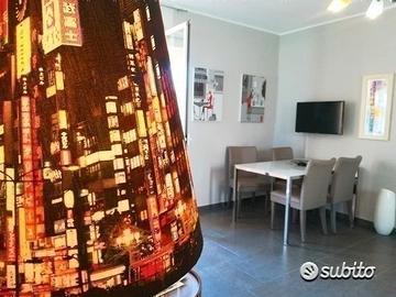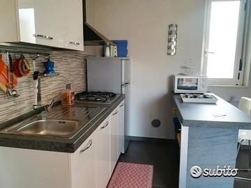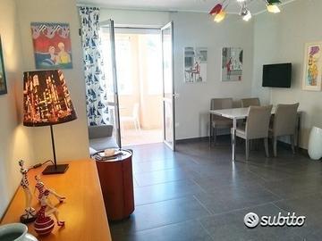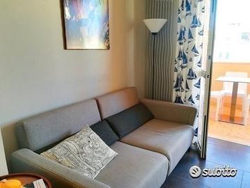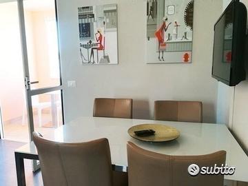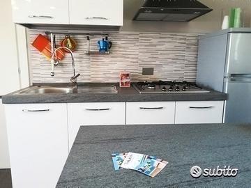 L'appartamento vanta due camere da letto finemente arredate: una matrimoniale e l'altra con letti a castello, offrendo soluzioni flessibili per gli ospiti. Il bagno completo con box doccia e la sala da pranzo con divano letto matrimoniale offrono comfort e praticità. L'angolo cottura con penisola è completamente attrezzato con tutte le stoviglie necessarie, mentre il balcone abitabile è perfetto per momenti di relax all'aperto.
