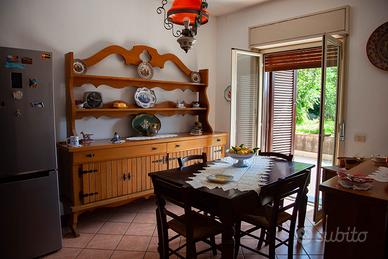Una vacanza memorabile in Sicilia "Montagna & Mare" in Trecastagni (CT), un delizioso paese collinare, sul versante sud dell'Etna, in una villa, con panorama mozzafiato, che domina il Golfo di Catania. Dal cancello d'ingresso, attraverso il vialetto si accede in area posteggio, collegata al piano terra da sei gradini, con adiacente area a verde che circonda la struttura. La villa è circondata da un ampio spiazzo e sul versante sud da largo terrazzo attrezzato a "solarium". e tavolo per 8-10 posti e barbecue. La porta d'ingresso si apre in un disimpegno, che dà su un prestigioso soggiorno, diviso in due aree: salotto e pranzo, arredato con mobili antichi dell' 800, la maggior parte in stile siciliano, con due ampie vetrate che danno sul terrazzo sul versante sud. Procedendo dritto dal disimpegno, sul lato SX si trova ampia cucina, in muratura, piastrellata, con fornetto, piano cottura, con cappa, frigo/freezer, munita di sportelli sotto, con ripiani, per allocare detersivi e pentolame, cassettiera, e altro sportello per le stoviglie. Il resto della stanza dedicata all'area pranzo, arredata con mobili in rovere massello, tavolo per 6 persone. Procedendo dritto dal disimpegno sul lato DX in un incavo c'è una credenza in arte povera, in uno dei cassetti c'è il necessario per il Pronto Soccorso; ferro e tavolo da stiro; a seguire il servizio completo con doccia. Adiacente al servizio, nella parte esterna, il casotto con la lavanderia. Dal soggiorno, attraverso una rampa di scala si accede alla mansarda, dove si trovano 2 camere con letto matrimoniale "king size"; camera singola; servizio completo con vasca/doccia. Tutte gli ambienti muniti di finestre a vasistas con gli oscuranti.