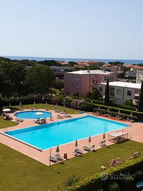 L'appartamento si compone da angolo cottura soggiorno con divano, disimpegno, una camera da letto matrimoniale con letto matrimoniale e l'altra camera con due letti singoli. Bagno con box doccia. Ampia terrazza attrezzata per il pranzo all'aperto fronte piscina. Accessoriato con tv color, lavatrice, clima (solo camera matrimoniale le altre stanze hanno ventilatori a soffitto, lavastoviglie.