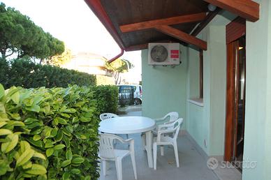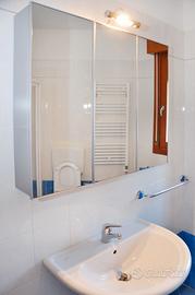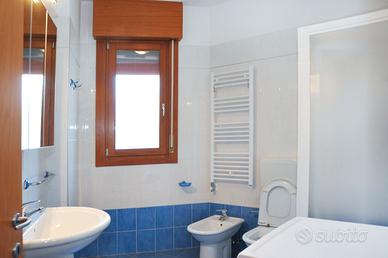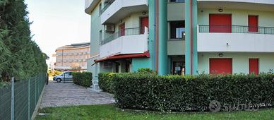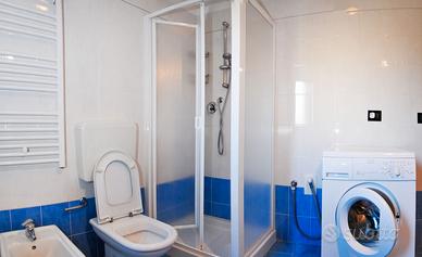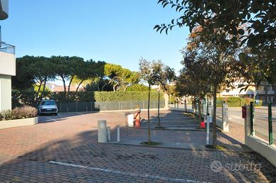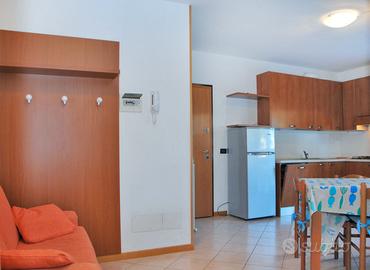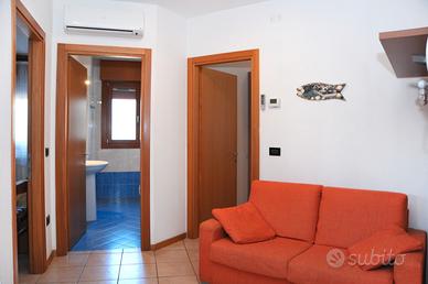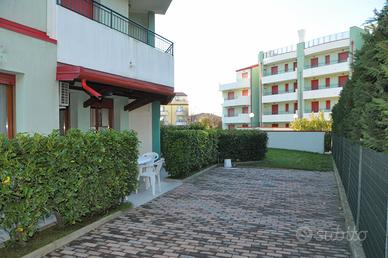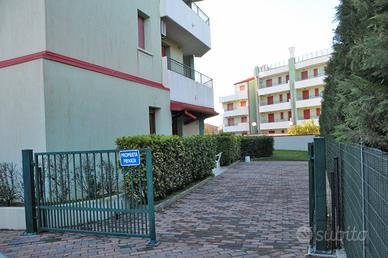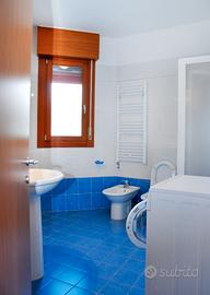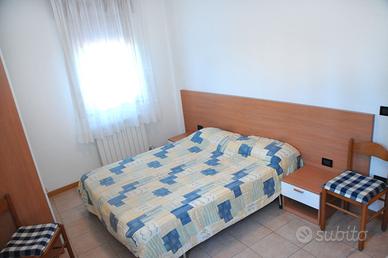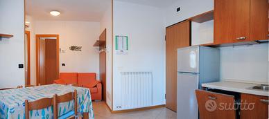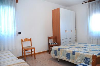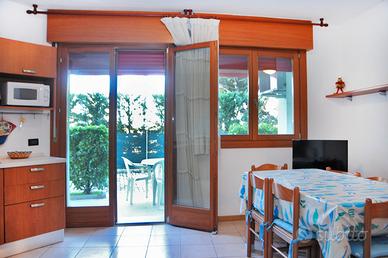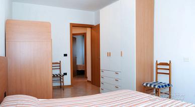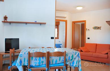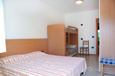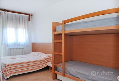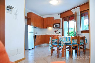 Ampio trilocale al piano terra con scoperto esclusivo e doppio posto auto; appartamento di grandi dimensioni composto da scoperto esclusivo pavimentato e dotato di tavolo e sedie da esterno, ingresso-soggiorno con angolo cottura, disimpegno, ampia camera matrimoniale con letto matrimoniale e letto a castello, seconda camera con letto matrimoniale e letto singolo, bagno finestrato con box doccia e lavatrice.