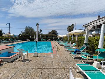 Accesso a piscina condominiale sorvegliata e attrezzata con ombrelloni, lettini, sedie regista.