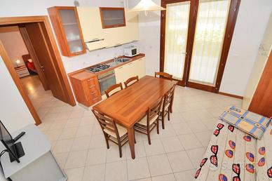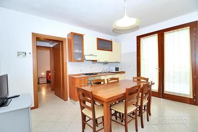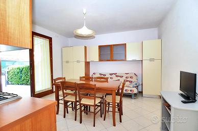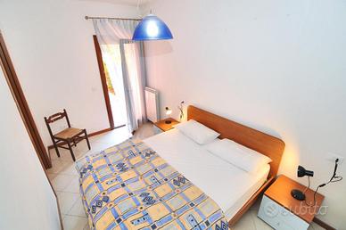 Spiaggia di levante, 300 mt dalla spiaggia e 450 mt dal centro storico. Residence con due grandi piscine ed ampi spazi verdi. Trivano grande pian terreno; si compone di: giardino privato con posto auto, soggiorno con angolo cottura e divano letto matrimoniale, camera con letto matrimoniale e accesso ad uno scoperto esclusivo recintato, seconda camera con letto matrimoniale , bagno finestrato con box doccia. Dotazioni e servizi inclusi: zanzariere, frigo con congelatore, forno elettrico, forno a microonde, lavatrice, aria condizionata, arredo da esterno con tenda manuale, N° 02 posti spiaggia ( due ombrelloni e quattro lettini), pulizie finali, consumi, diritti d'agenzia.