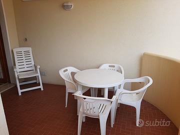 E' composto da cucina, soggiorno/pranzo con divano letto, 2 camere da letto, bagno con box doccia, terrazzo abitabile attrezzato con tavolo e sedie, posto auto numerato.