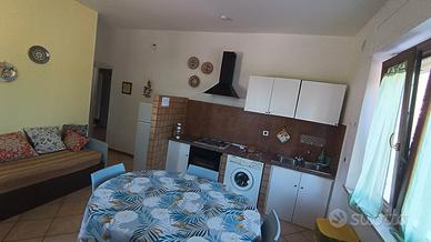 Appartamento trilocale al pian terreno posti letto 4/6, soggiorno con angolo cottura, camera matrimoniale con un letto aggiunto, cameretta con due letti scesi, doppi servizi, posto auto interno, barbecue, zona privata con grande ombrellone e giardino in comune.
