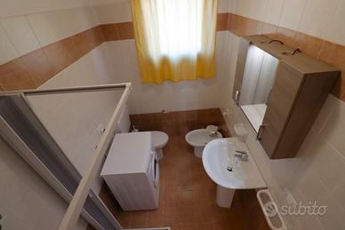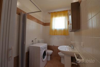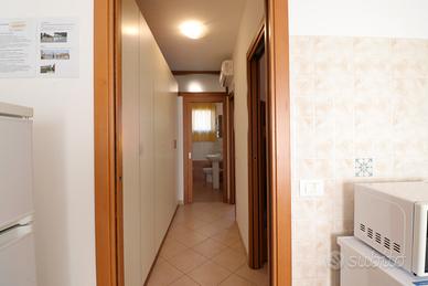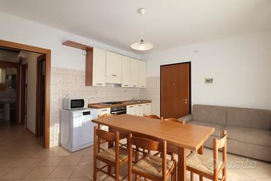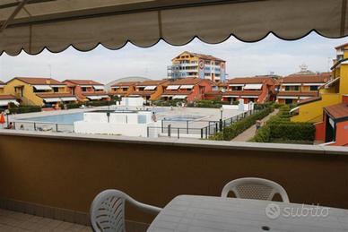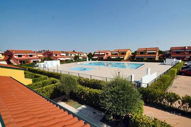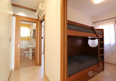Appartamento piano primo, in residence con doppia piscina (adulti e bambini) sempre al sole. Si compone di area di ingresso privata al piano terra, soggiorno con angolo cottura e divano letto matrimoniale, ampio terrazzo arredato, con tenda parasole affacciato sulle piscine, disimpegno, camera con letto a castello, camera matrimoniale con secondo terrazzo, bagno finestrato con box doccia.