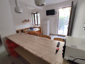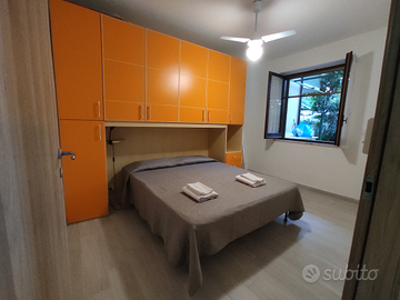 A meno di 200 metri dalla spiaggia libera e/o da lidi, fittasi a luglio e settembre appartamento con 5/6 posti letto, da poco ristrutturato, all'interno del "Villaggio dei Fiori", villaggio privato recintato e con uscita diretta sul lungomare di Davoli Marina, immerso nel verde e chiuso al traffico veicolare esterno, perfetto per famiglie con bambini. L'accesso al villaggio è regolato da un cancello veicolare elettrico ed è disponibile un'uscita diretta pedonale sul lungomare. L'appartamento è composto da: grande cucina abitabile con isola attrezzata, lavatrice, fornetto, TV, zanzariere, sistema di aerazione, 2 camere da letto, bagno con doccia, ampio giardino privato, parcheggio e docce esterne disponibili all'interno del villaggio.
