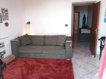 Soggiorno con divano letto matrimoniale, ventilatori a soffitto e portatili, zanzariera