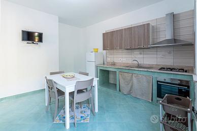 Appartamento bilocale più bagno composto da soggiorno con cucina in muratura, frigorifero, tv, letto singolo. Bagno attrezzato con doccia e lavatrice. Camera da letto con letto matrimoniale, armadio e luminosa finestra. Ampio spazio esterno, doccia esterna, barbecue in muratura , giardino e parcheggio privato all'ombra. La struttura è munita di ARIA CONDIZIONATA, sia nel soggiorno che nella camera da letto.