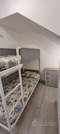 L'abitazione dispone di una veranda arredata con tavolo da pranzo, perfetta per gustare i pasti all'aria aperta, un accogliente salotto con angolo cottura, una camera matrimoniale, due letti a castello situati in una zona dedicata della casa, e un bagno con doccia.