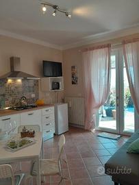Appartamento di 35 mq 3 posti letto+baby, completo di cucina accessoriata, divano letto, zona pranzo, camera matrimoniale, bagno privato con grande doccia, portico esterno esclusivo con zona relax e pranzo. Aria condizionata, ventilatori, biancheria letto e bagno. Tv, Wi fii, microonde, frigo, lavatrice, ferro e tavola da stiro. Parcheggio privato.