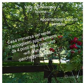 In casa indipendente, con vista sulle montagne, parcheggio privato e giardino, si affittano per brevi periodi due accoglienti appartamenti, un trilocale e un bilocale, che possono ospitare fino a 8 persone (4 persone per appartamento). La casa si trova a Issime, posto ideale per attività all' aperto durante tutto l'anno, a pochi chilometri dagli impianti sciistici del Monterosa Ski, in posizione tranquilla ma comoda ai servizi principali . Ogni appartamento è dotato di - ampia zona giorno con cucina attrezzata - bagno con box doccia - Wi-Fi gratuito - balcone privato - zona lavanderia con lavatrice Affitto mensile, settimanale e per weekend Prezzo speciale per il mese di giugno Luglio ancora qualche disponibilità Agosto al completo Maggiori informazioni al 349 2653907