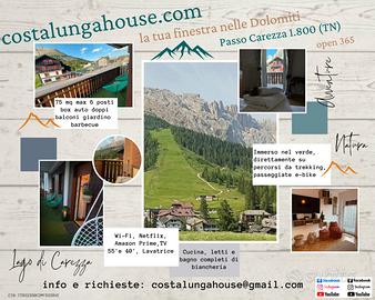 APERTA LA STAGIONE PRIMAVERA ESTATE 2026! CostaLungaHouse (con due grandi balconi abitabili e giardino esterno), sul Passo Costalunga e Carezza, a 1.800 metri di altitudine, immerso nel verde dell'area di Carezza, sul passo che unisce la Val di Fassa e la Val d'Ega. Direttamente sugli impianti sci di CarezzaSKI Pra di Tori e Hubertus (si esce di casa e si sale sulla seggiovia) e a 15 minuti a piedi, dal Lago di Carezza, con le finestre di fronte alle Dolomiti, sulle vette del Latemar e Rosengarten/Catinaccio (quello che al tramonto diventa rosa). Davanti l'appartamento, c'è una fermata del bus con direzione Bolzano, dove in 5 minuti siete a Nova Levante (BZ) e in 40 minuti alla stazione di Bolzano. Direzione Val di Fassa, in 10 minuti siete a Vigo di Fassa. Servizi da SKYBUS. MAX 6 posti letto, BOX AUTO interrato sotto l'appartamento e parcheggio esterno. AMPIO soggiorno luminoso e vivibile, con divano letto matrimoniale, TV 55 pollici, lettore DVD e CD e giochi da tavola. GRANDE camera con letto matrimoniale e due letti a castello, con TV e grande armadio. CUCINA attrezzata di tutto: frigo, forno, forno a microonde, tostapane, bollitore, Nespresso a cialde, tisane e the. In dotazione piatti, bicchieri, posate, pentole e tegami Lagostina. BAGNO finestrato con vasca, lavatrice, aspirapolvere e asciugacapelli. A disposizione degli ospiti, delicati e profumati prodotti per l'igiene personale. DOPPIA esposizione con DOPPI balconi abitabili, con vista sul LATEMAR e ROSENGARTEN. Primo piano senza ascensore. Animali di piccola taglia, sono benvenuti. Convenzionati con il negozio sotto l'appartamento, per il noleggio di attrezzature sportive