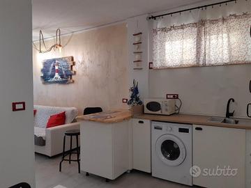 Composto da : soggiorno con angolo cottura , 1 camera con letto matrimoniale, 1 bagno, 1 piccolo ripostiglio. Corredato di : piano cottura a induzione , microonde, grande frigo con congelatore, accessori e pentole per cucinare. Dispone di divanoletto, smart tv 42", aspirapolvere, lavatrice, asciugatrice, WIFI, ARIA CONDIZIONATA, riscaldamento a metano. Parcheggio davanti casa gratuito.