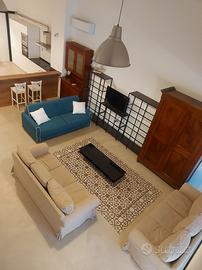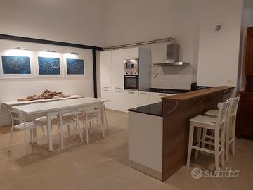 Soggiorno con cucina a vista completamente attrezzata con piano cottura ad induzione, forno, microonde, frigorifero,lavastoviglie, macchina caffè Nespresso