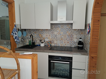 L'appartamento e' composto da una veranda esterna in cui e' possibile cenare, con un piccolo giardino, una camera matrimoniale, una camera con letto a castello, angolo cottura, sala con divano letto. Sul retro e' presente un terrazzino con lavandino e lavatrice.