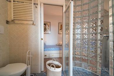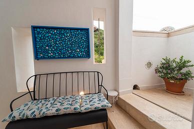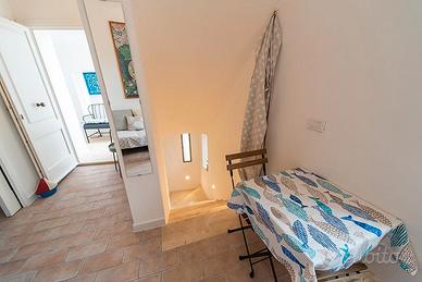 Dal salotto, una scala in marmo conduce al piano superiore, dove si trova una luminosa camera da letto, anch'essa con un soffitto in legno antico, un letto matrimoniale, un bagno con vasca e una splendida vista sul mare, oltre a una spaziosa terrazza arredata con un tavolo da pranzo e piante mediterranee con una meravigliosa vista sulle colline circostanti, il paese e il mare.