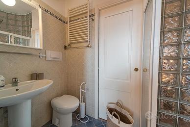 Dalla cucina abitabile si accede direttamente al luminoso e ampio salotto, con un grande divano, un tavolo di vetro originale e varie sedute con vista sul paese e sulla valle. Accanto si trova la stanza con l'abbaino, con un alto soffitto in legno a travi, tipico della zona, una grande finestra panoramica e adiacente, un bagno con doccia. A seconda delle esigenze, questa stanza può ospitare uno o due letti singoli o un letto matrimoniale.