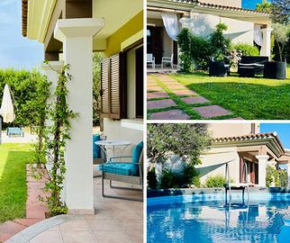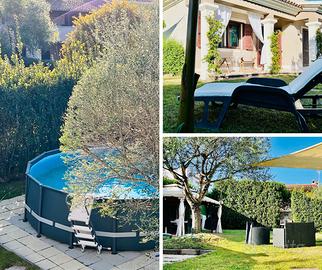 affitto bellissima villa singola vicina al mare, con ampio giardino su 4 lati, disposta su due livelli, composta da cucina soggiorno tre camere e due bagni. gazebo con arredi esterni. piscina fuori terra , posti auto in giardino, a 200 mt effettivi dalla spiaggia attrezzata con chiosco bar, noleggio lettini e ombrelloni, noleggio gommoni.