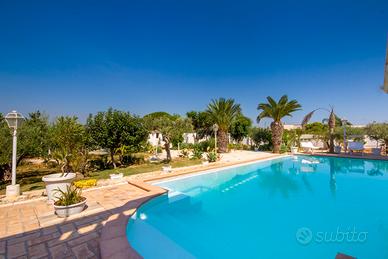 Spazi esterni: una veranda coperta, alberi, stagno con animali da cortile (oche, anatre, galline, pavoni)ampio giardino con palme, ulivi e piante di tutti i tipi.