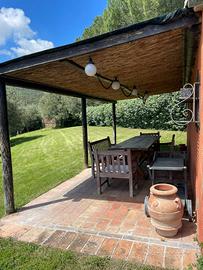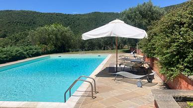La villa (400mq), elegantemente arredata e distribuita su due piani, offre 4 camere da letto (8-9 posti letto), 4 bagni, 2 ampi saloni con camini in pietra, una sala da pranzo e una cucina ben attrezzata. Parcheggio riservato, ampio giardino recintato (4000mq) con zone living. La piscina (mt 14x7) con impianto a sale è ad uso esclusivo e aperta da giugno a settembre.