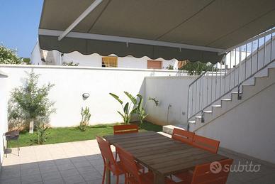Villetta articolata con zona giorno al piano terreno e zona notte al piano ribassato con camere dotate di apertura per accesso allo spazio all'esterno e composta da: giardino antistante l'abitazione con porticato, ingresso soggiorno con n.2 divani letto matrimoniali, tinello cucina con TV, n.5 condizionatori, 2 bagni, lavatrice, n. 3 camere da letto di cui due matrimoniali ed una singola con possibilità di aggiunta di ulteriore letto per trasformarla in una terza camera matrimoniale, area all'aperto retrostante attrezzata con tavolo e sedie in legno, area barbcue, accesso al terrazzo con incantevole vista mare.