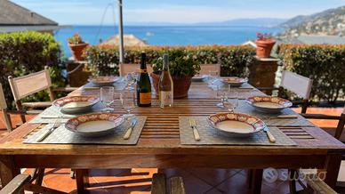 Immersa nelle dolci colline di Recco, tra ulivi secolari e il profumo del Mediterraneo, Villa degli Ulivi è un rifugio esclusivo dove privacy, eleganza e natura si incontrano. Una dimora pensata per chi desidera vivere la Riviera Ligure con stile, comfort e totale tranquillità. All'interno, la villa accoglie gli ospiti con ambienti luminosi e curati nei dettagli: o 4 camere matrimoniali , ognuna con aria condizionata e proprio bagno.; (al primo piano 2 camere matrimoniali (190x170) ed 1 camera con letto ad una piazza e mezza (190x140), mentre la quarta camera anch'essa matrimoniale (190x160) con aria condizionata ed il suo bagno, si trova al secondo piano adiacente ad un meraviglioso salone di oltre 100 m) o 5 bagni moderni e raffinati, dotati di finiture di qualità; o Zona living al piano terra elegante e spaziosa, con grandi aperture che portano la luce e il verde direttamente dentro casa e si affaccia su una grande terrazza; o Cucina completamente attrezzata, ideale per cene in famiglia o per chef privati su richiesta. . Grande salone al secondo piano con biliardo professionale. Il vero cuore della proprietà si trova però all'esterno: un grande giardino panoramico che abbraccia la casa, punteggiato da ulivi e piante. Qui potrai vivere momenti indimenticabili nella piscina privata, goderti un aperitivo al tramonto o cenare sotto le stelle nell'area pranzo all'aperto. (Dimensioni piscina La piscina misura 6,30 m di lunghezza, 4,90 m di larghezza, 1,40 m di profondità nella parte superiore e 1,60 m in quella inferio La villa può ospitare fino a 8 ospiti. N.B. La Villa viene affittata come casa vacanze quindi con un costo per notte I prezzi: Aprile-Maggio-Ottobre E. 750.00 per notte min. 5 notti Giugno-Settembre E. 950 per notte min. 5 notti Luglio-Agosto E. 1.050 per notte min. 5 notti Spese pulizia e biancheria E. 350.00 Chiuso da Novembre/Febbraio