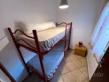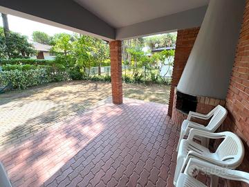 Villa singola immersa nel verde ideale per famiglie con bambini, a Lignano Riviera, composta da 2 camere, 1 studio, soggiorno con con angolo cottura + 1 divanoletto, 1 bagno, TV, aria condizionata, lavatrice, patio esterno, giardino privato e recintato con posto auto. Distanza dal mare m. 150.