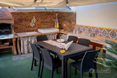 L a struttura completamente indipendente e ad uso esclusivo presenta 2 ingressi, lato principale e strada privata che scende al mare. ha una magnifica terrazza vista mare dove poter pranzare e rilassarsi godendosi la veduta panoramica. La parte antistante presenta un ampio giardino con prato inglese e diverse piante tropicali, arredato in diverse zone con gazebo, ombrelloni, sdraio prendisole, salotti, poltrone e lettini. E' presente anche l'area BBQ per squisite grigliate con la possibilità di poter cucinare e pranzare sotto un grande ombrellone a braccio. La doccia esterna spaziosa e confortevole è coperta