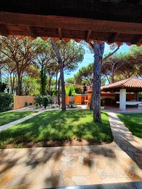Ad accoglierci troviamo un curatissimo giardino su tre lati, caratterizzato da zone di prato verde, una suggestiva pineta privata, aiuole fiorite e aree rifinite con ciottoli. Eleganti passaggi in pietra conducono al loggiato che abbraccia la casa, dove confortevoli salottini esterni invitano a momenti di puro relax.