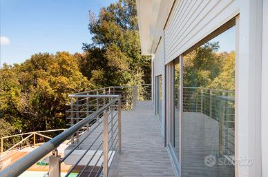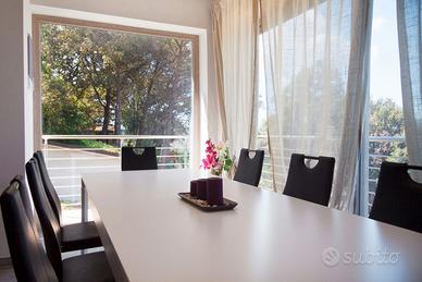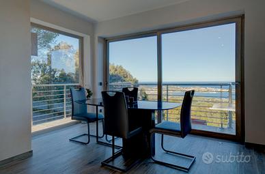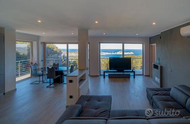 Villa completamente indipendente situata in una delle zone più panoramiche dell'isola, una collina che si apre sul Golfo di Portoferraio. Villa su due piani - 10/11 posti letto Proprietà che si struttura su due livelli non comunicanti. Il piano superiore di 85 mq si compone da grande salone luminoso con vetrate sul mare, open space con cucina attrezzata, e divano letto matrimoniale. Splendida terrazza vista mare attrezzata per mangiare all'esterno. La zona notte si compone di una camera matrimoniale, una camera con due letti singoli unibili, un bagno con vasca. Il piano inferiore di 110 mq è composto da ampio soggiorno con divano letto matrimoniale; due camere matrimoniali ed una camera con letto a castello, un secondo bagno. Aria condizionata in tutte le camere e nei soggiorni. La proprietà è circondata da un ampio giardino di circa 350 mq, area relax con gazebo, piscina di 6*3mt ad uso eclusivo e zona bbq. La proprietà, in stile moderno, é di recentissima costruzione, la corrente viene prodotta da impianto fotovoltaico. Note Importanti: - non sono ammessi gruppi di ragazzi di età inferiore a 25 anni - apertura piscina: 01/05/2023 - 05/10/2023 - check-in dalle 16.00 alle 19.30 e check-out entro le 09.00; per check-in dopo le ore 20.00 va pagato un supplemento di € 50,00 - animali non ammessi - come in tutte le nostre proprietà è vietato fumare al loro interno - cauzione (obbligatoria): 500 euro (rimborsata entro 48 ore da fine soggiorno tramite carta di credito; nel caso in cui venga pagata in contanti può essere restituita il giorno del check-out dopo le ore 15.00) - biancheria da letto e da bagno: 20,00 euro per persona (da richiedere al momento della prenotazione); non prenotabile sul posto - la strada per raggiungere la villa è sterrata, siete all'interno di un parco - SU RICHIESTA POSSIBILITA' DI AGGIUNGERE 3 POSTI LETTO, PER UNA CAPIENZA MASSIMA DI 14 PERSONE