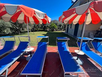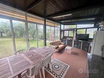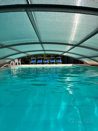 All'esterno, giardino, tavolo da ping pong, barbecue grande, la splendida piscina 6x12, con copertura telescopica in policarbonato che fa aumentare la temperatura dell'acqua nei periodi fuori stagione, trampolino e solarium attrezzato con lettini, sdraio, ombrelloni professionali e una bellissima spa jacuzzi 7 posti. Una bella e luminosa cucina esterna in muratura, attrezzata con barbecue e piano cottura, frigo grande, pozzetto congelatore, Smart tv, calciobalilla, comodo divano letto, bellissimo tavolo allungabile e sedie, dove si può pranzare o organizzare grigliate indimenticabili, comoda d'inverno, poiché chiusa con vetrate scorrevoli.