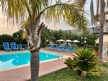 Dalla scala esterna si accede all'appartamento al 1° piano, totalmente indipendente, dove si trovano due camere da letto, con letto matrimoniale e letto a castello e una camera da letto, più piccola, con due letti singoli o un letto matrimoniale, un bagno completo e una lavatrice, una grande e luminosa cucina con divano letto, che si affaccia sulla bellissima piscina.