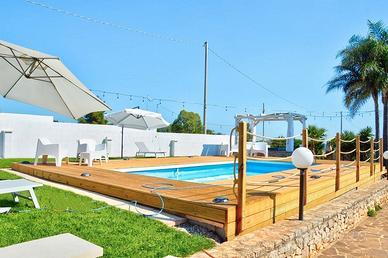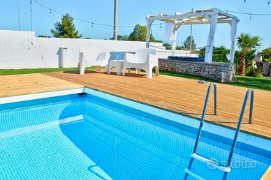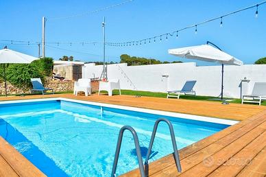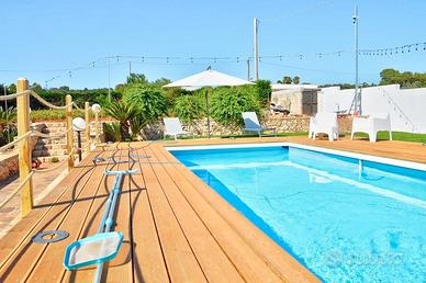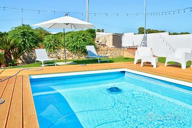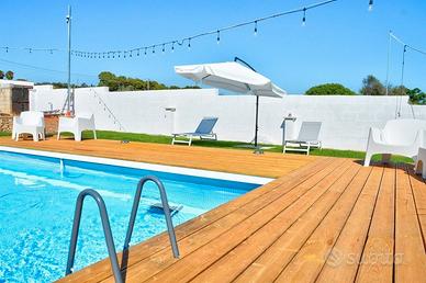 La piscina privata è il cuore della proprietà, un'area riservata e attrezzata con lettini e ombrelloni per prendere il sole. Con dimensioni di circa 7 x 3 metri e una profondità di 1,10 metri, è l'ideale per rinfrescarsi e godersi momenti di assoluto relax, anche con le luci serali che creano un'atmosfera magica.