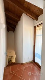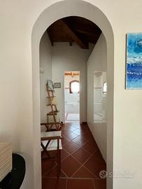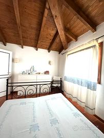 Una luminosa camera matrimoniale climatizzata, arredata con eleganza, dotata di bagno privato con vasca e accesso diretto alla terrazza solarium, ideale per rilassarsi al sole in totale privacy.