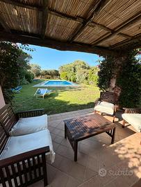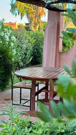 Doppio Patio esterno: Attrezzata con tavolo da pranzo e sedie, perfetta per cene all'aperto con vista sulla piscina e sul rigoglioso giardino circostante.