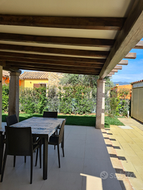 Villa unifamiliare su due livelli vicino alla spiaggia di Cala Sinzias con tre camere matrimoniali, soggiorno con angolo cottura, due bagni, due loggiati esterni, due docce esterne e ampio giardino con prato verde. Parcheggio interno. La spiaggia di Cala Sinzias si trova a 500 metri ed è raggiungibile a piedi. Disponibile nei mesi di maggio luglio e settembre 2026. Periodo minimo una settimana. Prezzo al giorno per sei persone: maggio euro 200, giugno euro 250, luglio euro 300, settembre euro 250. Spese pulizia euro 100,00. Fornita la biancheria da letto e bagno.