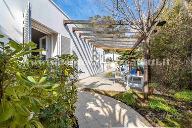 la villetta è dotata di giardino con 2 posti auto interni, al quale giardino si accede da uno scivolo ripido per cui non ci entrano le auto basse, stile sportivo, ma solo quelle alte, questa è una cosa molto importante poichè i parcheggi all'esterno si pagano al giorno.