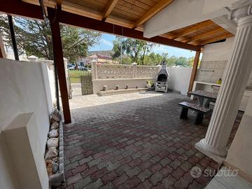 L'esterno è il vero punto di forza: un pratico cucinino attrezzato con barbecue consente di preparare pasti all'aperto, mentre una tettoia in legno garantisce un'area ombreggiata dove rilassarsi e godersi il fresco anche nelle ore più calde.