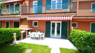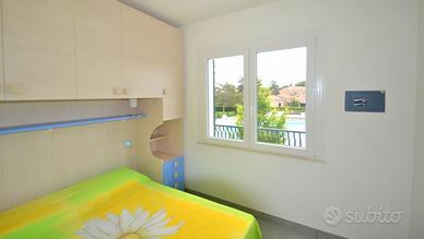 Villetta a schiera su due piani composta a piano terra da soggiorno con divano letto doppio, angolo cottura. Al primo piano c'è una camera da letto matrimoniale, 1 camera con due letti singoli, bagno finestrato con box doccia, terrazzo abitabile. Dotata di climatizzatore, lavatrice, lavastoviglie, microonde, tv, cassaforte, tenda da sole. Arredamento moderno. Giardino privato e recintato fronte piscina. Parcheggio numerato scoperto.