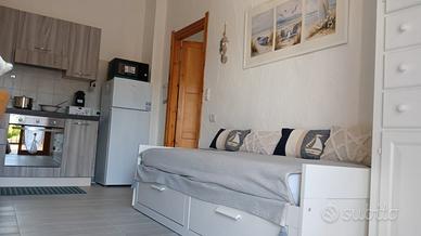 Appena entri, l'aria fresca del climatizzatore ti accoglie. Le ventole a soffitto muovono lievemente l'aria, mentre la luce del sole filtra dalle finestre, accarezzando il soggiorno con angolo cottura moderno e completo di tutto: piano a induzione, forno, microonde, frigorifero e persino una macchinetta Nespresso per il primo caffè del mattino.